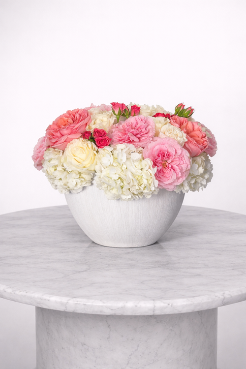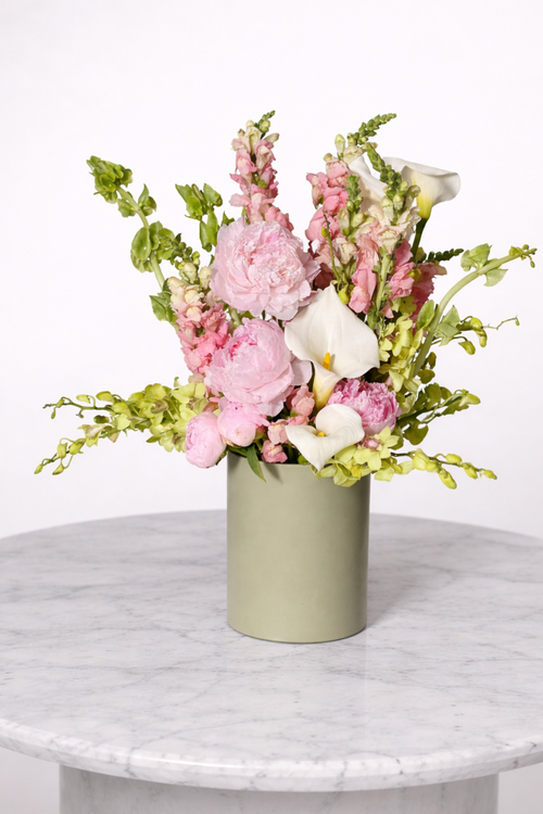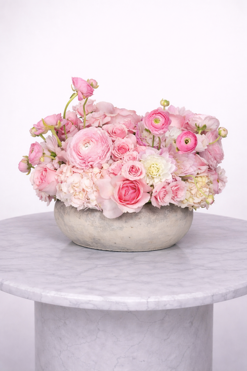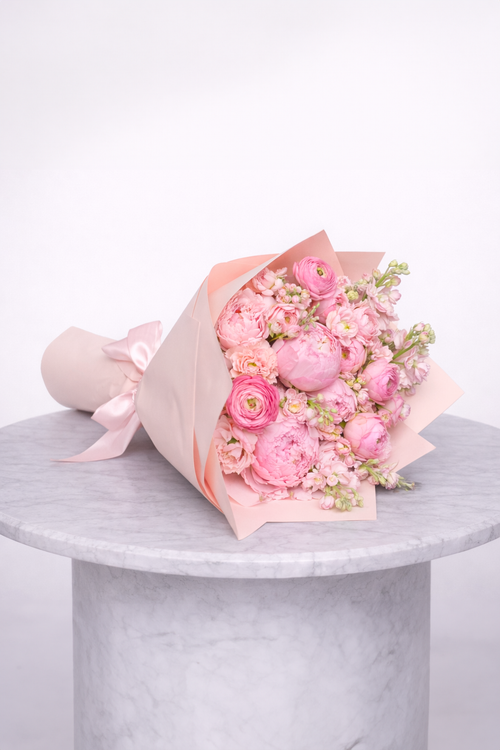 Handcrafted with premium seasonal flowers, this piece features soft pink ranunculus, pink peonies, and accented with fresh green buds. Each stem is thoughtfully arranged to create a naturally full, rounded silhouette with gentle movement and dimension.